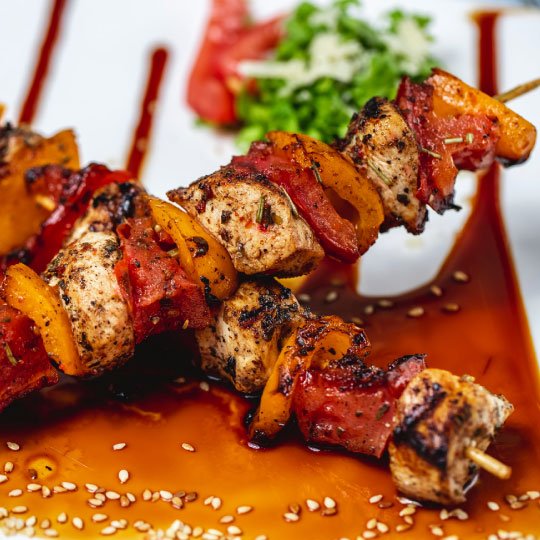 BROCHETA MIXTA PECHUGA, RES, CERDO, CHORIZO Y VEGETALES.